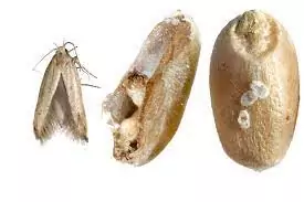 Ein Weibchen legt im Laufe seines Lebens bis zu 400 Eier. Die Eiablage erfolgt auf allen Getreidearten, Reis, Hirse, Buchweizen, Kakaobohnen, Edelkastanien und Grassamen. Nach etwa 4 Tagen schlüpfen die 1 mm langen rötlich-gelben Larven und bohren sich in das Getreide ein. Sie entwickeln sich vollständig in dem ausgehüllten Getreidekorn. Kurz vor der Verpuppung fressen sie ein 1 bis 2 mm großes Loch in das Korn, aus dem sie als Falter schlüpfen. Der Falterflug ist vom Mai bis zum Juni.