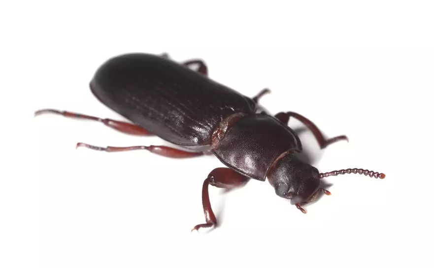 Erwachsener Käfer sind etwa 2 bis 4mm lang, Körperform von länglicher abgeflachter Gestalt, rotbraun gefärbt, Körper leicht glänzend. Larve langgestreckt, gelblich, am Hinterleibsende zwei spitze Anhänge.